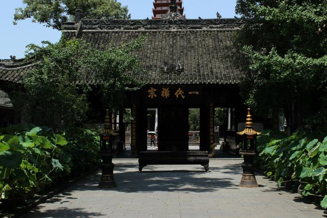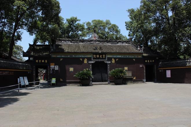 绕过照壁,这处善男信女常排着队、蒙着眼,试着去摸墙上“福”字的“宝地”,再跨过山门“慧眼常明”牌匾下的门槛,我和姐姐终于进入了宝光寺。这照壁和山门,可以说是佛寺的标配,而宝光寺的一大特点,正是完整地保留了早期寺庙的传统布局。山门内的第一进院落,是悬有四川军阀邓锡侯所题“一代禅宗”匾额的天王殿。天王殿后七佛殿前的院落中,立在中轴线上的,便是那尊舍利塔了。而左右悬山屋顶带门廊的厢房,形制上等同于古城中常见的联排房屋,贯穿了整座寺院,承担着客堂、偏殿等次要的职能。在七佛殿后,地位最显赫的大雄宝殿和藏经楼一字排开,终于使这座寺庙功德圆满。成都市内文殊院的布局亦略存此遗风,然而山门与天王殿并用,塔已不存,民间热衷的观音殿代替了少见的七佛殿,为了存放康熙御笔的“空林”,又新增了一处说法堂。