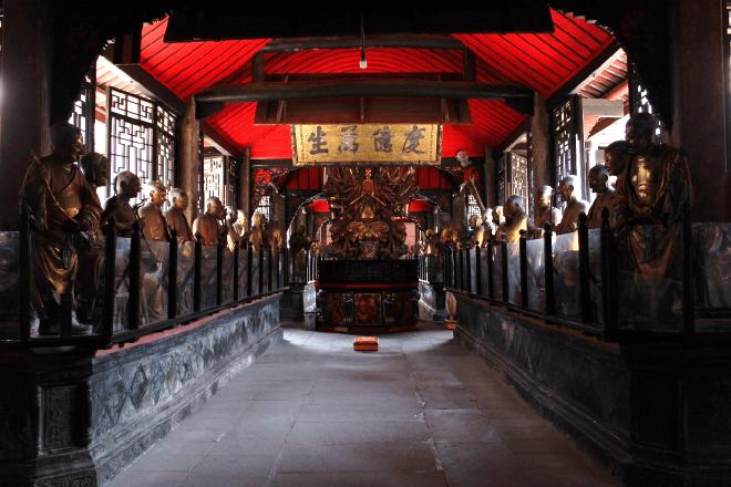 在罗汉堂外的一进小院内,还保存着一块刻有寺庙全景的清代石碑。走近细看,现存的建筑就好比镜花水月般定格在这百年以前的石刻之上,让人不得不感慨寺庙保存之完整。实际上,在去新都不远处,还坐落着一个名叫新繁的城镇,它是成都府自古以来便管辖的几座县城之一。那里的龙藏寺,曾经香火鼎盛,宝光寺不过是它的从寺罢了。然而,子孙视之不甚惜,在连年的破坏和强占之后,龙藏寺的僧侣早已四散,殿堂也所剩无几,百亩庭中半是苍苔,明代曾装饰过精美壁画的庙宇,如今也几近坍圮,只余下一块国保碑还在向游客们宣告着当年的胜事。如今,新繁县治早已遭到撤销,它蜕为一个街道而被并入新都的管辖中。宝光寺所在的新都却摇身一变,升格为成都的市辖区。新都人保护寺庙的苦心经营,是否在冥冥之中,也为城市的未来积攒了功德?